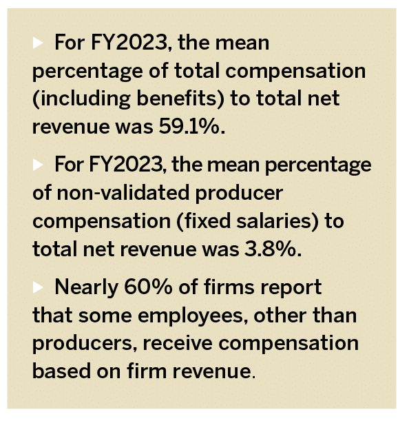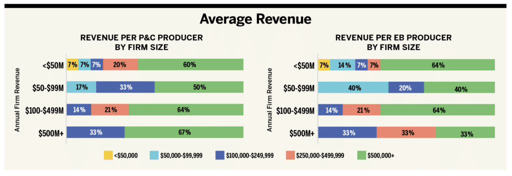 In terms of producer-generated revenue, across all firm sizes and both industry segments, the majority of producers generate over $500,000 in revenue, with larger firms generally having a higher percentage of producers in that revenue bracket. Smaller firms show more producers in the lower revenue brackets.