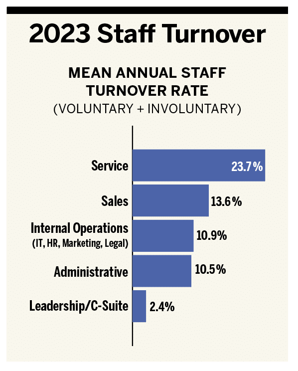 Respondents reported that 61% of employee turnover is voluntary, indicating a competitive job market. Firms must continue to focus on retention strategies, particularly with data showing the most significant turnover in service staff (where the total average turnover rate in 2023 was over 23%).