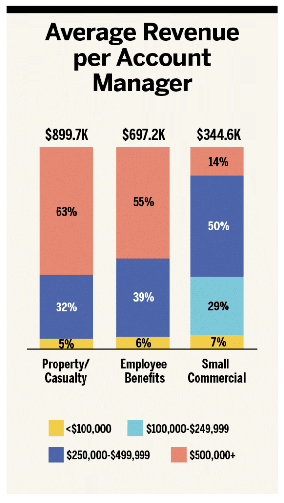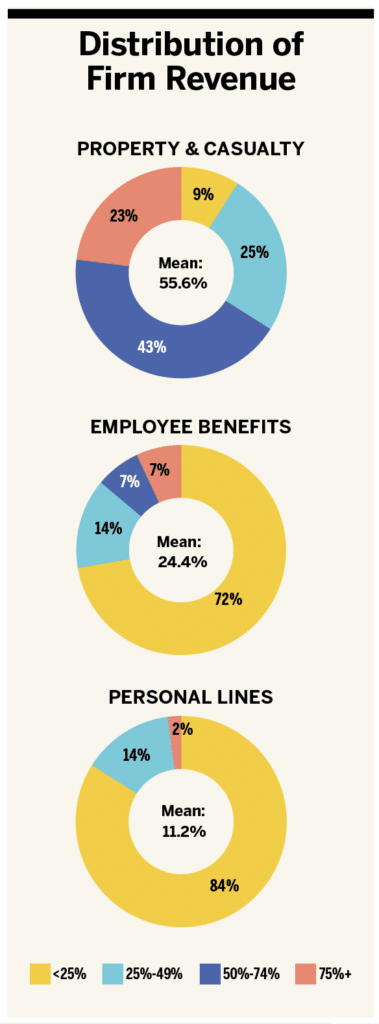 Property and casualty (P&C) continues to account for most revenue among brokers of this size, representing on average over 55% of total current agency revenue, followed by employee benefits (EB) at about 24% and personal lines at 11%.