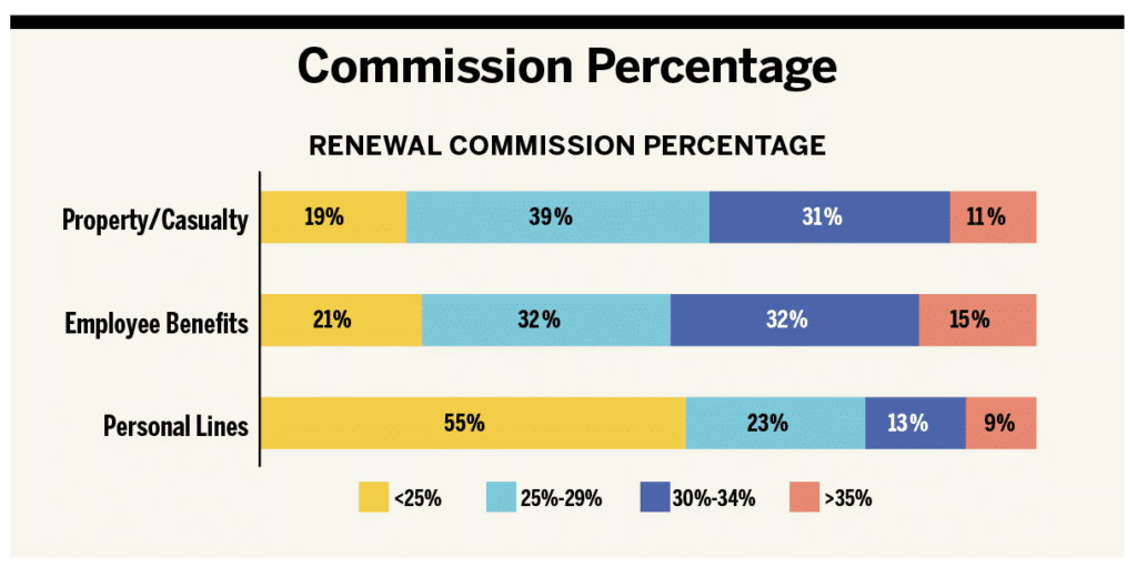 Data on compensation suggests that current P&C and EB renewal commissions cluster between 25% and 34% of written premium, with a smaller percentage of firms offering higher-than-average commissions. Personal lines, on the other hand, shows a more conservative commission structure, with most firms offering less than 25%, suggesting potentially lower profitability or less aggressive commission structures in that segment. The average commission paid on renewals is 27% for both property and casualty and employee benefits, and 17% for personal lines.