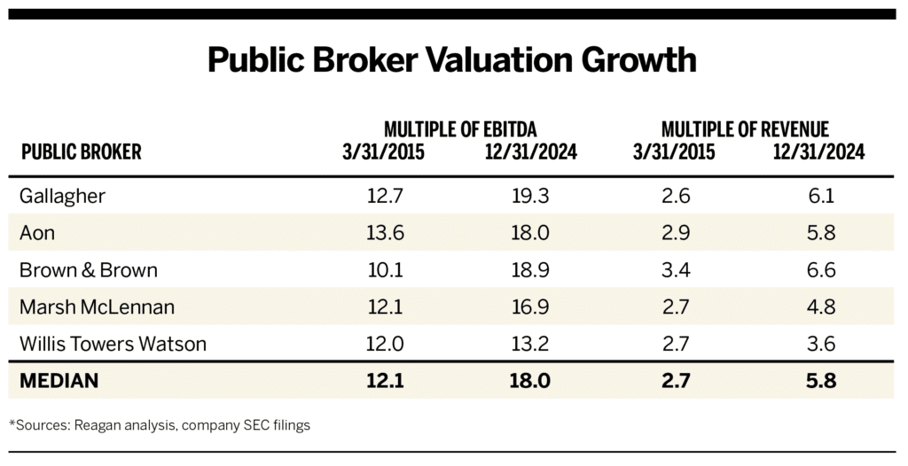 Publicly traded insurance brokers, which have traditionally traded at valuations of approximately 12 times EBITDA, today trade at a median multiple of 18 times EBITDA. Expressed as a multiple of revenue, valuations have more than doubled—from a median of 2.7 a decade ago to an eye-popping 5.8 today.
