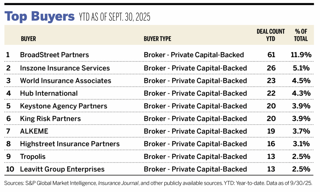 Ten buyers accounted for 45.4% of all announced transactions year to date, while the top three (BroadStreet Partners, Inszone Insurance, and World Insurance) accounted for 21.4% of the 513 transactions.
