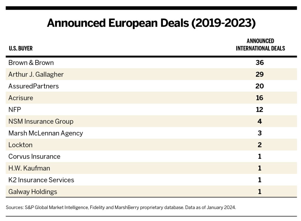 U.S.-based buyers also remained active in Europe, growing their deal activity on the continent at a 37% CAGR from 2019 to 2023. Expanding their insurance-brokerage footprint into new territories represents a large component of these firms’ growth strategies.