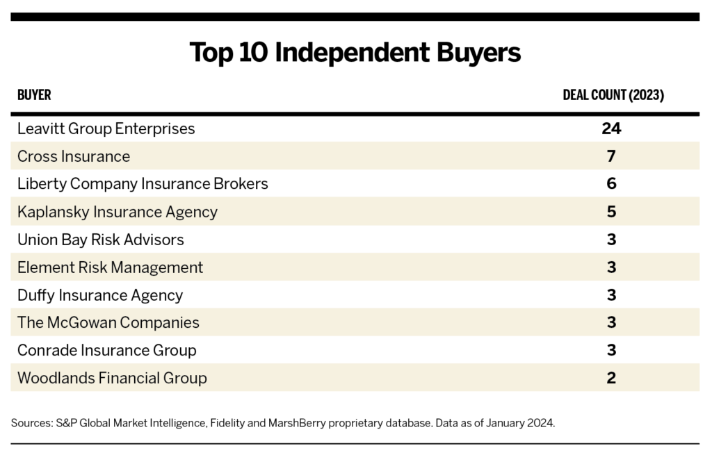 As in 2021 and 2022, Gallagher was the most active buyer; its 32 deals comprised 64% of the announced transactions from this group. Gallagher chairman and CEO Patrick Gallagher cited “a very strong merger pipeline” during the company’s third-quarter 2023 earnings call, noting around 45 term sheets signed or being prepared.