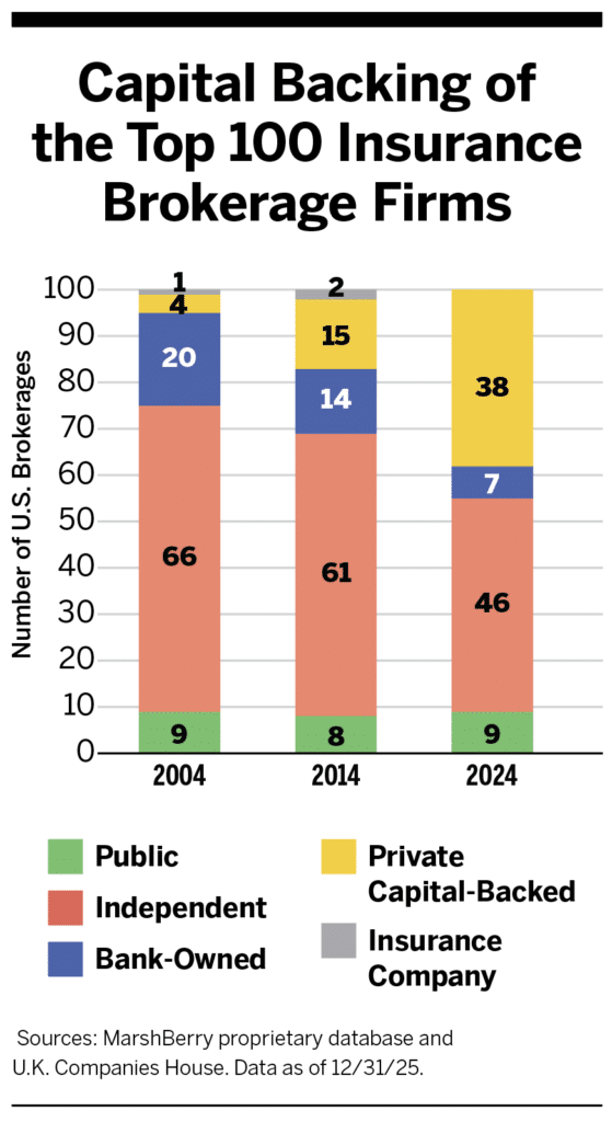 Ownership of the top 100 U.S. insurance brokerage firms, based on revenue and primarily comprised of property and casualty (P&C) business, has changed over the past 20 years. Most notable has been the simultaneous shrinking of the number of independently owned firms and the increase in private capital-backed brokerages.