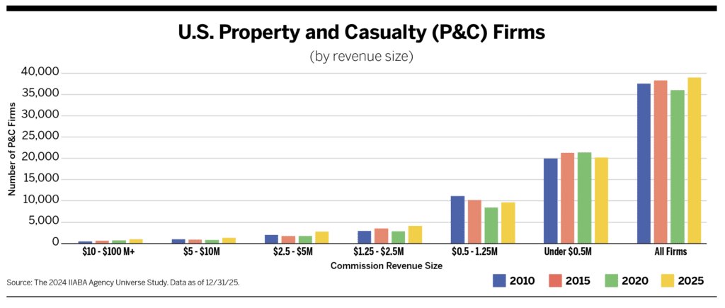 The total number of P&C firms also continues to grow. This initially seems counterintuitive, as M&A indicates a decrease in market size. Over the past 15 years, nearly 10,000 P&C insurance brokerages have sold. Yet, there are 1,500 more P&C firms in 2025 (approximately 39,000) than there were in 2010 (approximately 37,500). Essentially, for every firm that sells, another brokerage pops up.
