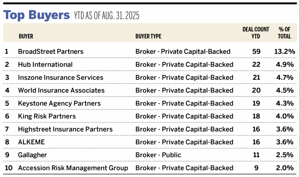 Ten buyers accounted for 47.3% of all announced transactions year to date, while the top three (BroadStreet Partners, Hub International, and Inszone Insurance Services) accounted for 22.9% of the 446 transactions.