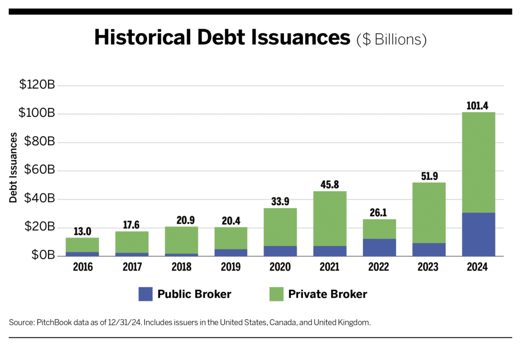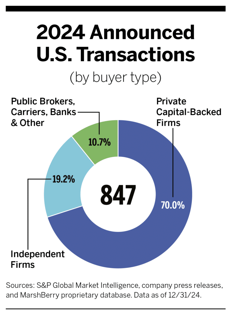 Private capital remains interested in insurance distribution because of the industry’s continuous resilience through all market conditions and strong financial results. Private capital-backed buyers are estimated to have raised nearly $64 billion in high-yield debt in 2024. Those buyers included 47 unique insurance brokerages, plus 12 “other” types of capital-backed buyers, such as investment firms and private capital-backed companies in other industries. That was a slight decrease from 52 unique brokerages and 16 “other” capital-backed buyers in 2023, and still a relatively small concentration compared to the total number of transactions.