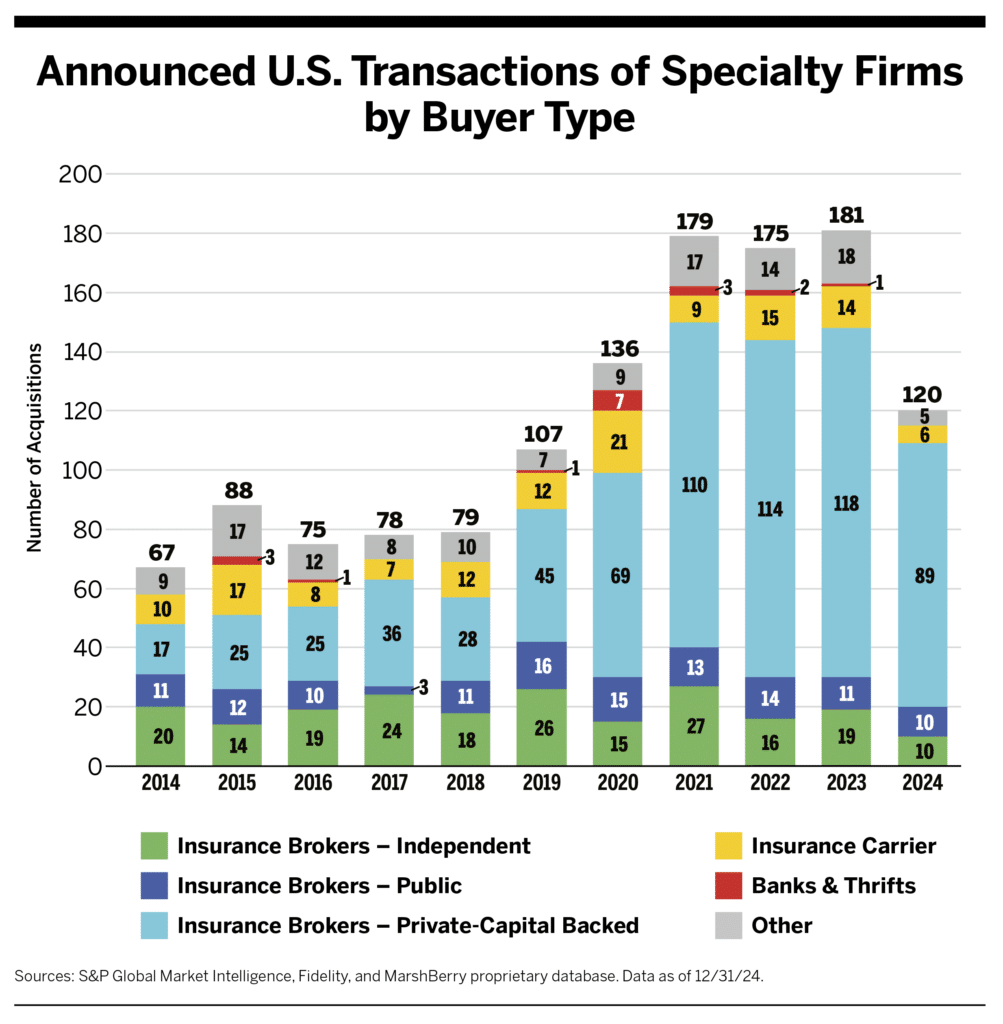 The 120 announced specialty firm M&A transactions in 2024 dropped steeply from 2021 (179 deals), 2022 (175 deals), and the record-high 2023 (181 deals).