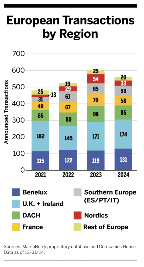 The 560 announced transactions last year in Europe was down approximately 6.8% from the 601 deals recorded in 2023. However, 2024 set a new record for the number of countries involved and the geographic spread of deal activity. Significant M&A activity among insurance brokers has been reported in at least 40 of the 51 recognized European countries, often involving major international brokers.