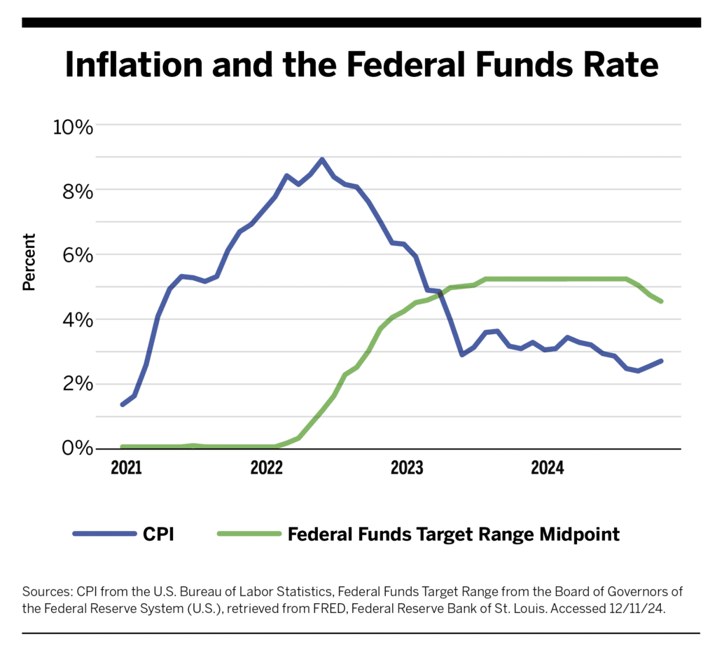 After 11 interest rate hikes since March 2022, the Fed’s battle with inflation finally ended in September 2024 with the first of three interest rate cuts: a 50-basis-point reduction that was followed by 25-basis-point cuts in November and December.