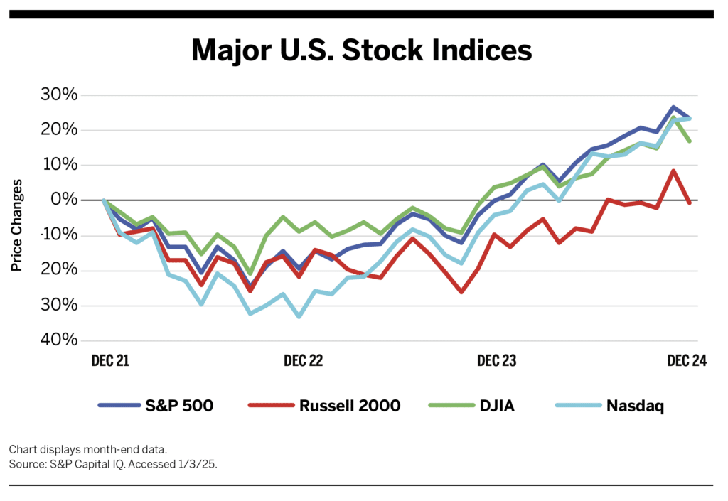 Equity markets grew strongly in 2024, as evidenced by major indices ending the year in positive territory. The four leading U.S. indices—the S&P 500, Dow Jones Industrial Average, Nasdaq Composite, and Russell 2000—rose 23.3%, 12.9%, 28.6%, and 10.0%, respectively. This was the second year of gains following declines in 2022.