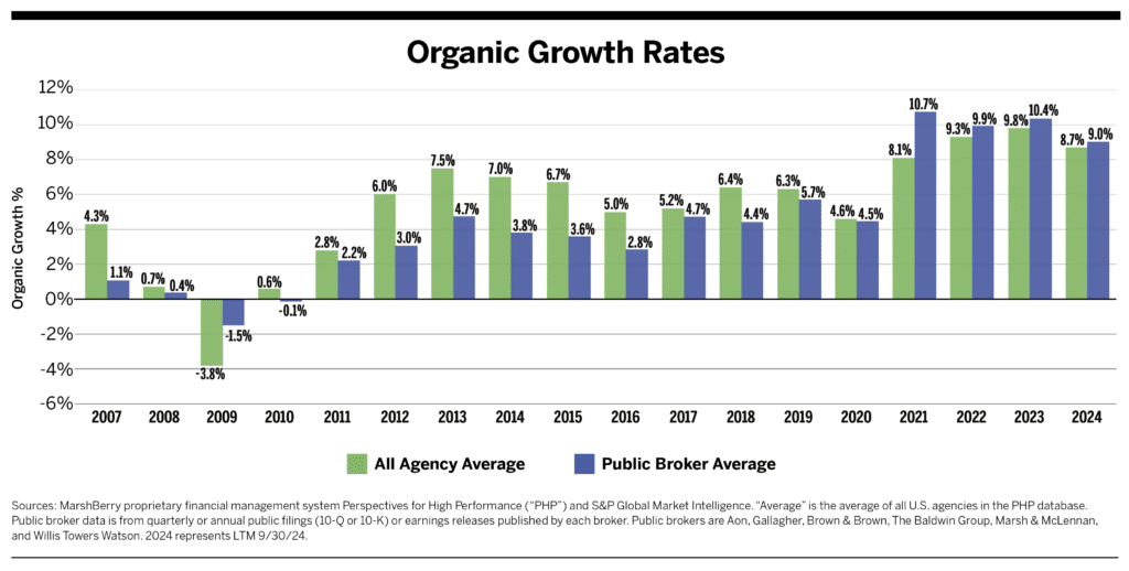 Despite a strong year for the insurance industry, organic growth rates declined for both public and independent brokers. In 2024, public brokers averaged 9.0% organic growth (down from 10.4% in 2023), while all agencies averaged 8.7% (down from an all-time high of 9.8% in 2023). The industry is still considered to be in a hard market environment, with premiums rising for most lines of business—but they are not rising as drastically as in previous years.