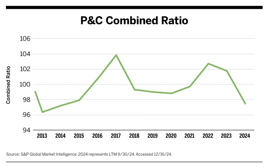 Through the first three quarters of 2024, the P&C market’s combined ratio registered below 100, with preliminary results indicating a ratio of 97.5.