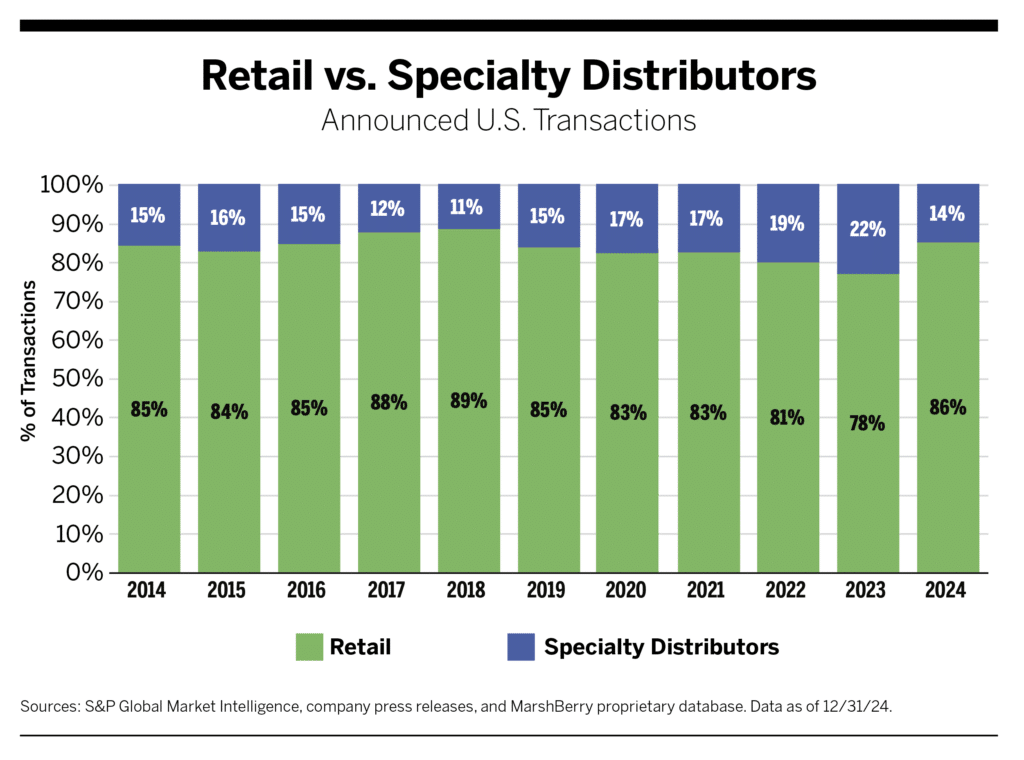 There were 120 transactions for specialty distributors, or 14% of the total acquisitions in 2024. This total deal count and percentage share were down from 181 and 22% in 2023. It also reverses the three-year trend of increasing percentage share for specialty distributors. The prevailing theory ascribes this decline to a lack of specialty firm sellers, rather than a shift in buyer interest, as quality specialty firms continue to fetch premium multiples.