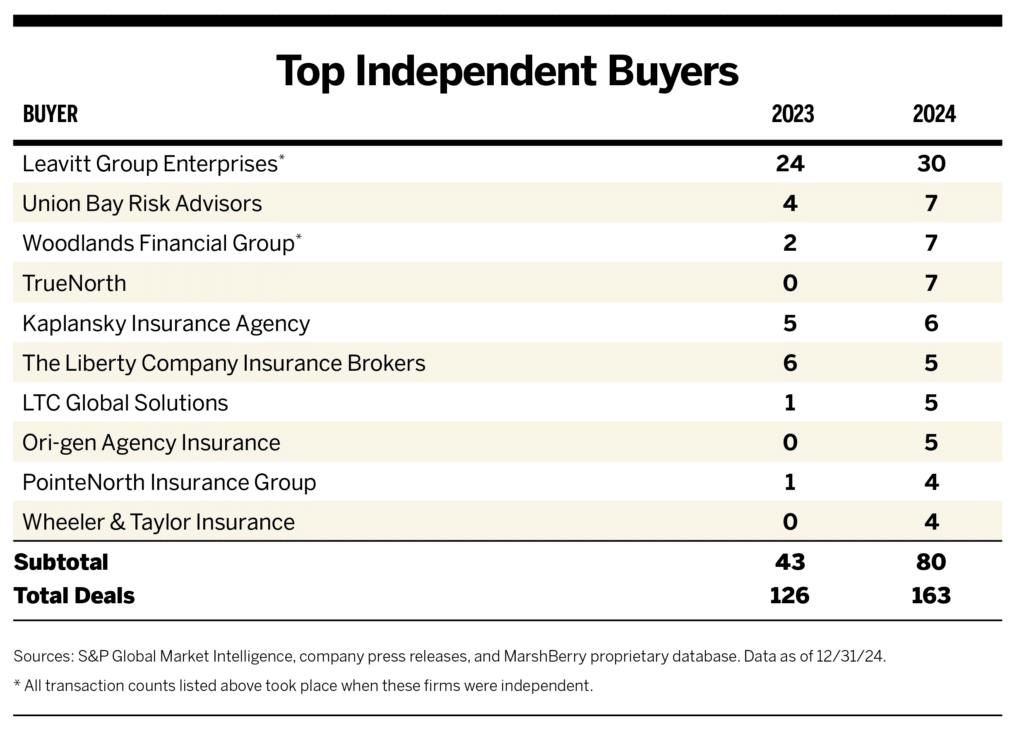 It’s worth noting that the Nos. 1 and 3 independent buyers, Leavitt Group Enterprises and Woodlands Financial Group, both underwent ownership changes last year that removed them from that segment going forward. With that change, independent firms’ market share is expected to decrease in 2025.