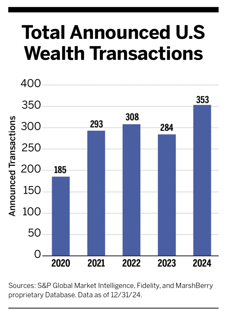 The wealth advisory M&A market delivered a record-high 353 transactions, a 24.3% increase from 284 transactions recorded in 2023 and beating the previous record from 2022 by 45 deals.