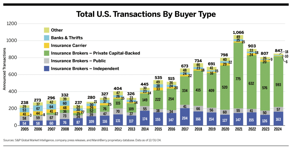 In 2024, there were 847 insurance brokerage transactions in the United States. This deal count represents a 5.0% increase from 2023 and the third most active year on record.