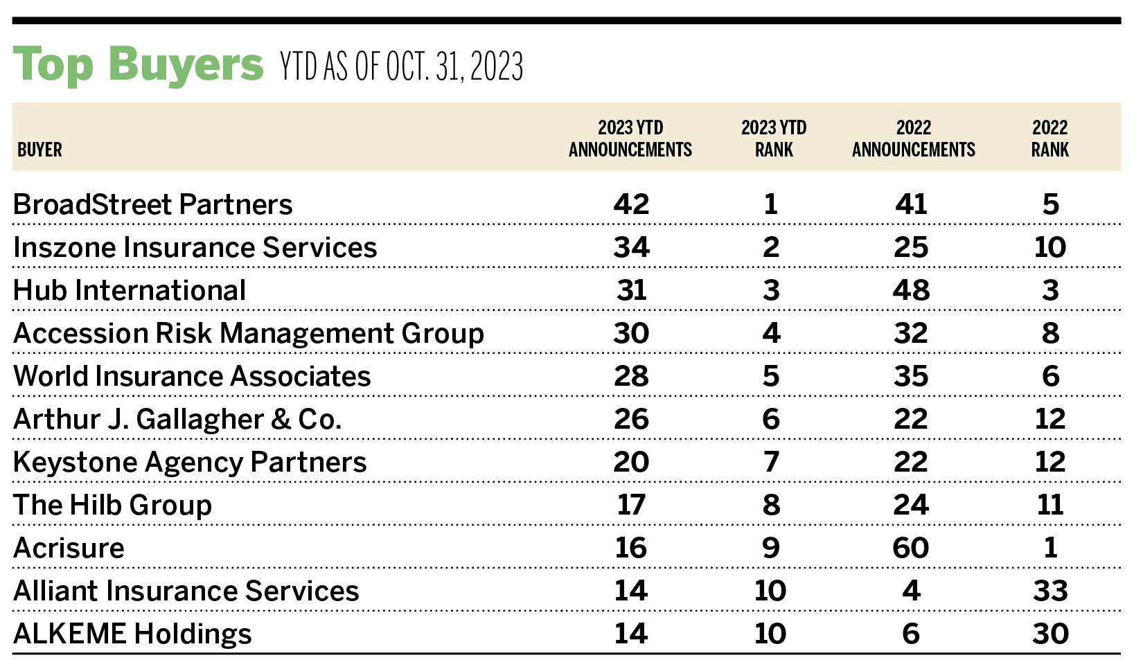 Deal activity from the marketplace’s most active acquirers has remained strong in 2023. Ten buyers account for 47.5% of all announced transactions, while the top four (BroadStreet Partners, Inszone Insurance Services, Hub International, and Accession Risk Management Group) account for 25.2% of the 543 total transactions.