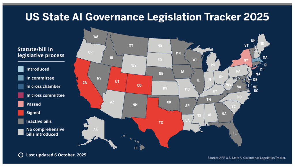 A company’s AI products or systems could be compliant in one state but violate rules in another state. Making compliance even more challenging, states like California, Colorado, Oregon, and New York frequently pass AI regulations and then amend or delay the rules in subsequent legislative sessions.