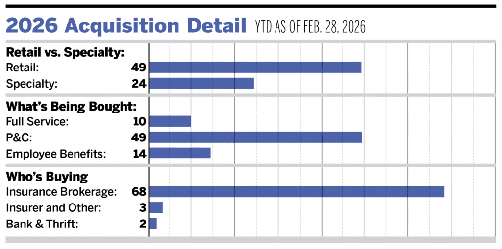 As of Feb. 28, there were 73 announced insurance brokerage M&A transactions in the United States in 2026—down from 85 deals announced last year at this time. Private capital-backed buyers accounted for 47 of the 73 deals (64.4%) through February. Independent agencies were buyers in 13 deals, representing 17.8% of the market. Bank buyers have announced two transactions year to date. Deals involving specialty intermediaries as targets accounted for 24 transactions.
