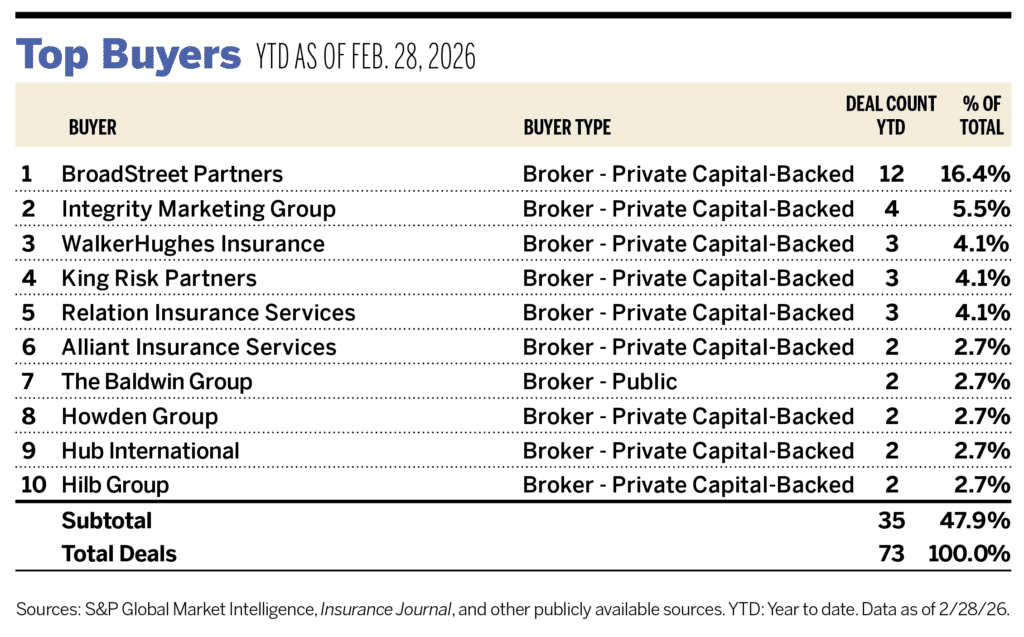 Ten buyers accounted for 47.9% of all announced transactions year to date, while the top three (BroadStreet Partners, Integrity Marketing Group, and WalkerHughes Insurance) accounted for 26.0% of the 73 transactions.
