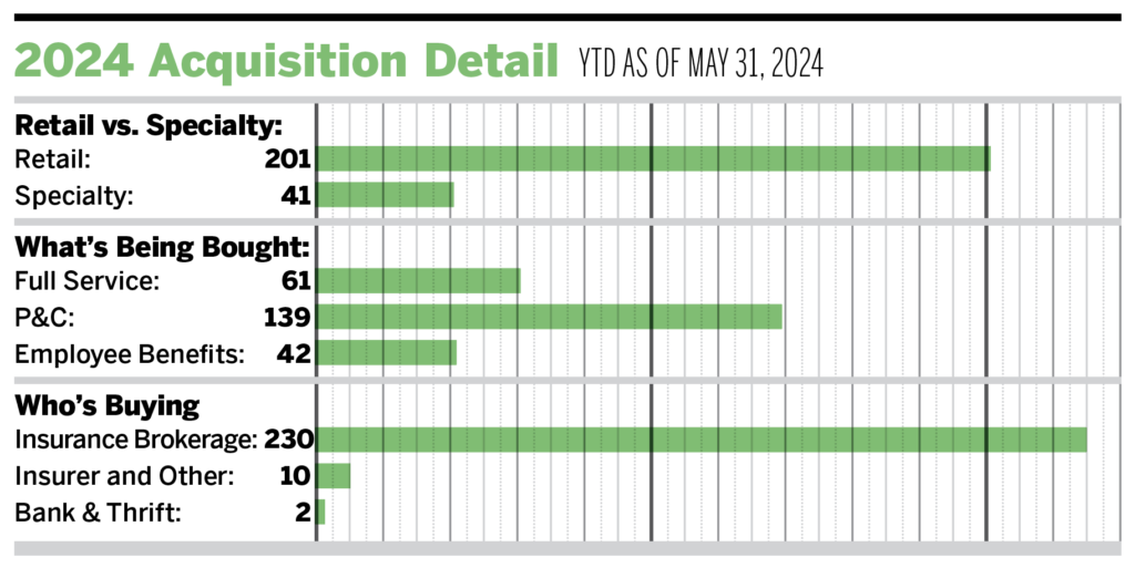 Independent agencies were buyers in 35 deals so far in 2024, representing 14.5% of the market, a slight decrease from 2023 when independent agency acquisitions represented 15.6% of the market. Transactions in which banks were buyers continued to fall, from 18 transactions in 2022 to nine in 2023—an all-time low. So far in 2024, bank buyers completed only two acquisitions through May.
