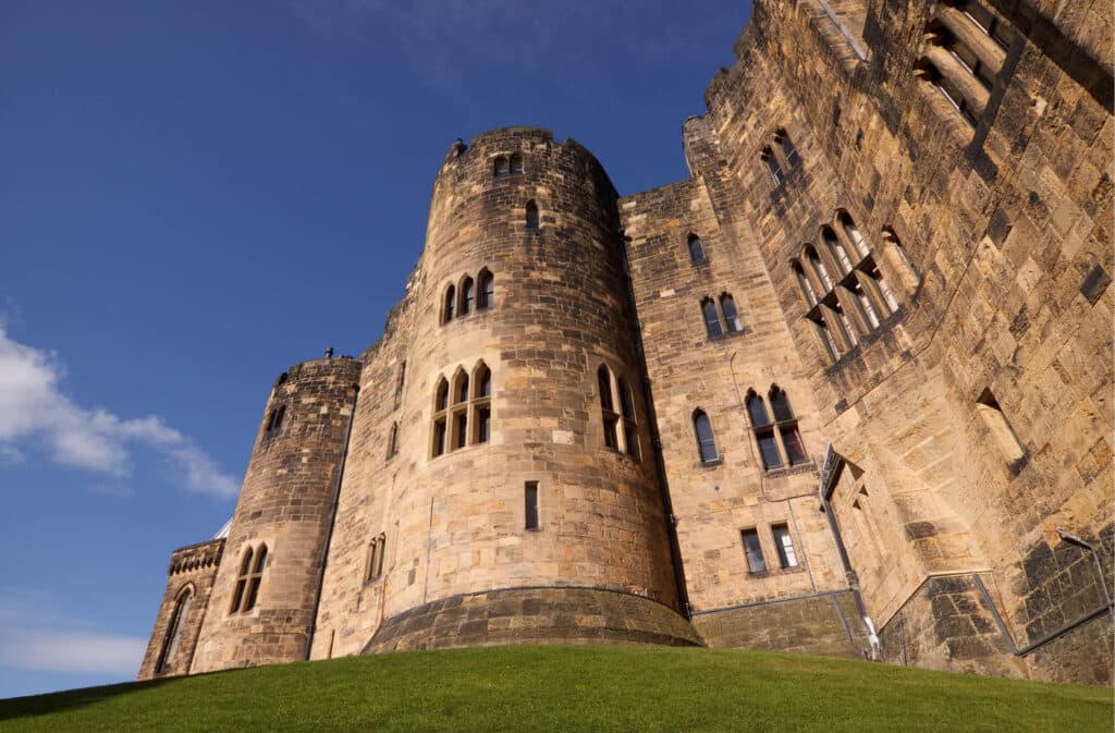 with 2-meter-thick walls, a 7-meter-deep moat, and thick oak gates. The defenses worked—the castle successfully repelled the King of Scotland, William the Lion, in both 1173 and 1174. Home to the Percy family for over 700 years, it has proudly served as a military outpost, teaching college, and, more recently, as Hogwarts— featuring prominently in the first two Harry Potter films, among many others.