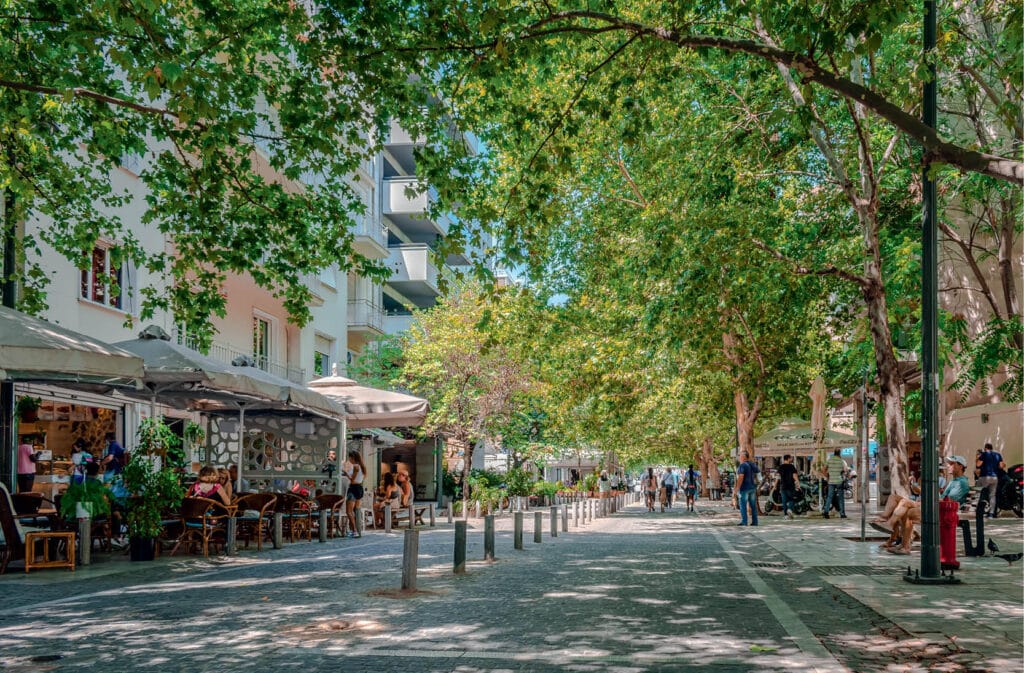 You’ll catch a sense of these defining spirits on Dionysiou Areopagitou Street, a pedestrian thoroughfare that hugs the base of the Acropolis, giving visitors a prime place to stroll and stare up at brightly lit sites such as the Theatre of Dionysus and the nearby Temple of Olympian Zeus.