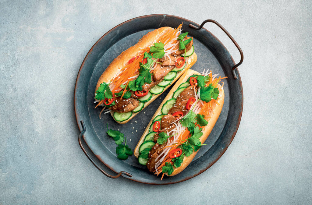 Banh Mi > Served on a crisp baguette, this sandwich deliciously combines meat, cheese, fresh and pickled vegetables, butter, and chili sauce.