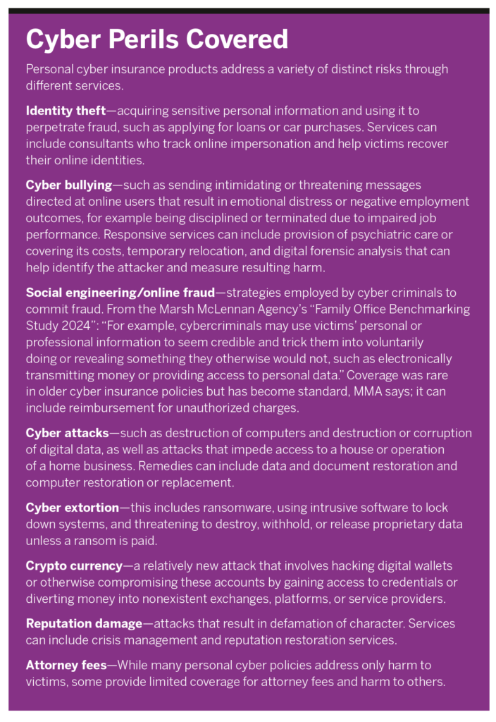 “While cyber endorsements cover some risks, as cybercriminals continue to evolve their schemes, these measures may not protect the family from uninsured or underinsured risks,” Marsh McLennan Agency (MMA) said in its 2024 “Family Office Benchmarking Study.”