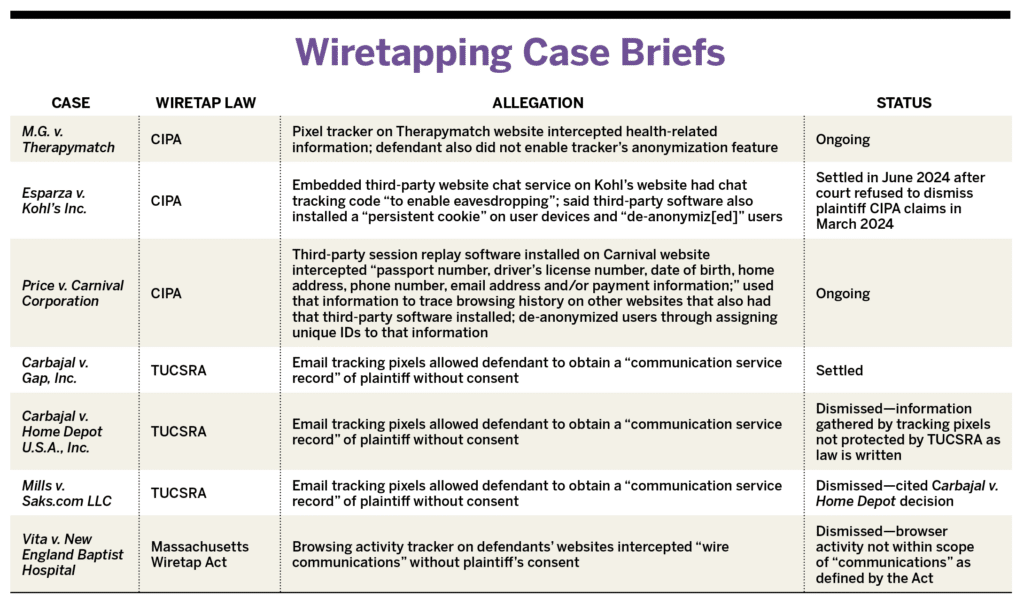 Anecdotally, courts seem less receptive to the Massachusetts law and TUCSRA, in contrast to CIPA cases, WilmerHale suggests. For instance: M.G. v. Therapymatch, Esparza v. Kohl’s Inc., and Price v. Carnival Corporation, all brought in part under CIPA, survived motions to dismiss, while Vita v. New England Baptist Hospital—brought under the Massachusetts law—and Carbajal v. Home Depot U.S.A., Inc. and Mills v. Saks. com LLC—both brought under TUCSRA— were dismissed outright. (See Sidebar: Wiretapping Case Briefs) M.G. v. Therapymatch, Esparza v. Kohl’s Inc., and Price v. Carnival Corporation reinforce Juntunen’s point about the need for caution when using third parties for data collection and analytics on company websites. The first two target the use of third-party email tracking pixels, while the third attacks session replay technology, which records a visitor’s activity on a website (such as mouse movement or keystrokes and replays that activity for outside analysis).