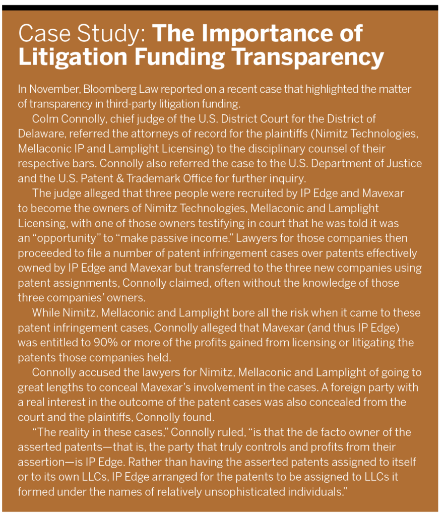 But there’s been little movement toward rules mandating disclosure of litigation funder involvement. There is no federal disclosure requirement, although federal courts in New Jersey and Northern California have implemented some form of disclosure rules. Colm Connolly, chief judge of the U.S. District Court for the District of Delaware, has issued standing orders requiring lawyers in his courtroom to report any third-party funding.