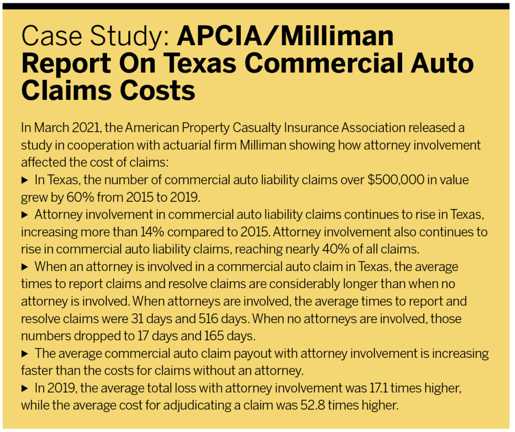 But verdict size is only a factor if cases are brought to trial and not settled outside of court, and more cases have been indeed moving to trial in recent years. “We’re seeing both a frequency issue, and we’re seeing a severity issue,” says Mark Berven, president and COO of Nationwide Property & Casualty. “More claims are moving into litigation, and the cost of resolving litigation is increasing at a rate that exceeds significantly general inflation trends.”